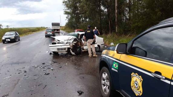 Ocorreu um acidente do tipo colisão frontal envolvendo um FIAT/siena branco de São Gabriel e um VW/fox prata de Novo Hamburgo, resultando em 3 óbitos no local e 2 feridos graves, todos tripulantes do siena.