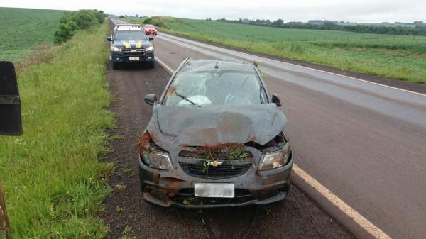 Logo após o meio-dia desta terça-feira, 18, a PRF atendeu um acidente no km 583 da BR 285, no município de São Luiz Gonzaga, onde um veículo GM Prisma, pertencente a uma locadora, que deslocava em direção a Santo Antônio das Missões, capotou após sair da pista, durante forte chuva.