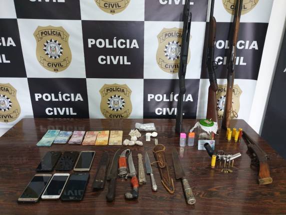 Na sequência, em uma chácara na Localidade de Esquina Rondinha, pertencente aos mesmos investigados, foram encontradas três espingardas, de calibre 20mm, 36mm e de pressão de 5,5mm, uma garrucha de calibre 20mm, cinco cartuchos de calibre 20mm, e quatro porções de crack pesando 42 gramas. Dois homens, de 51 e 23 anos de idade, natural de Entre-Ijuís e Santo Ângelo, respectivamente, ambos com antecedentes policiais, fprforamesos em flagrante pelos crimes de tráfico e associação ao tráfico de drogas, e posse ilegal de arma de fogo e munição de uso permitido.