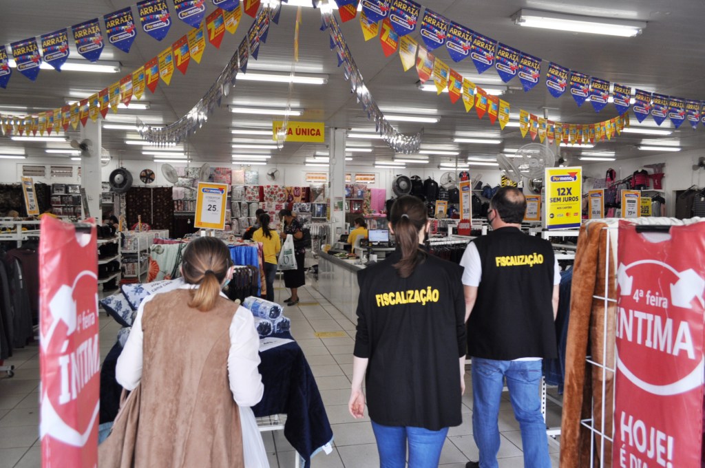 Na tarde desta quarta-feira (17), foi intensificada a fiscalização no comércio e, locais em desacordo com os protocolos de segurança, serão autuados. Em caso de reincidência, o infrator sofrerá sanções, de advertência, inclusive com suspensão do alvará e multa.
