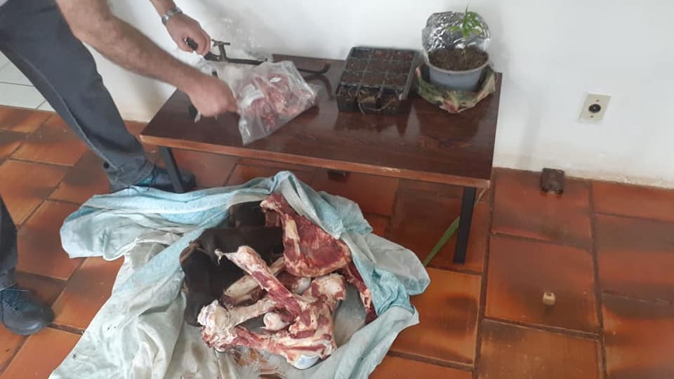 Assim que identificados os supostos autores, representou-se por Mandado de Busca e Apreensão na casa de três suspeitos e, além da carne e ossada, na casa de um deles, localizou-se um pé de “cannabis sativa” e mais uma embalagem para produção de 12 mudas da mesma planta, porém sem broto ainda, apenas a semente enterrada.