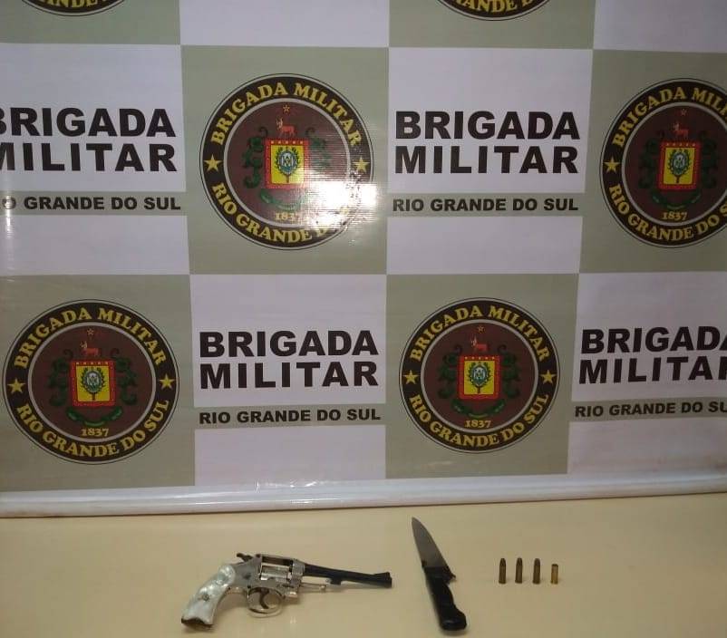 Após informação que um indivíduo estava em frente a uma residência ameaçando com uma arma de fogo, a guarnição deslocou ao local, abordou o homem e em revista pessoal encontrou em seu poder um revólver calibre. 32, quatro munições e uma faca.