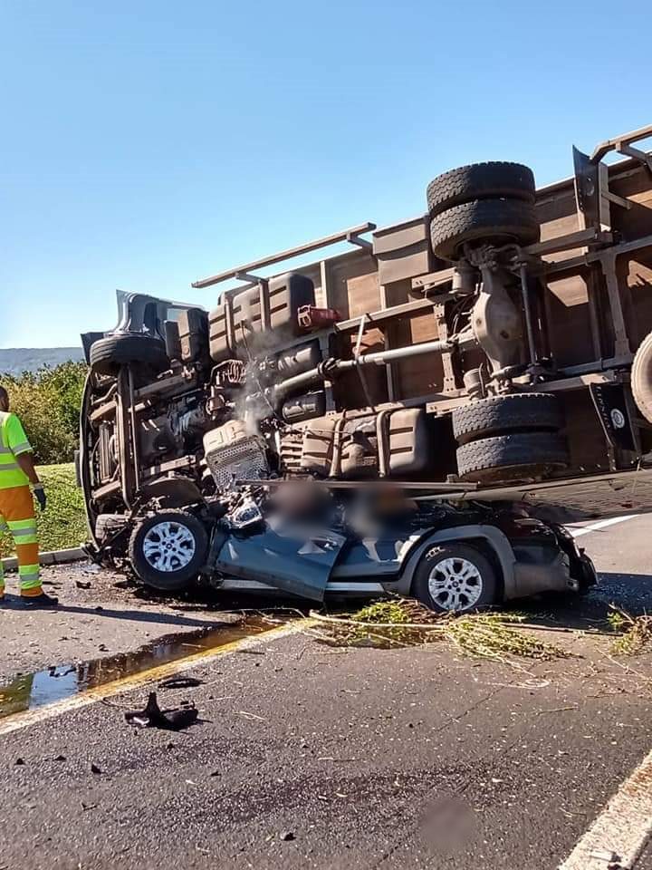 O caminhão, com placas de Santa Catarina (Cordilheira Alta), que transitava sentido litoral, invadiu a pista contrária e colidiu com o veículo.