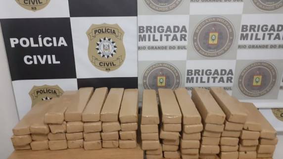 Um veículo táxi foi abordado no km 85, em Bom Progresso, sendo localizado com os dois ocupantes 65 tijolos de maconha, totalizando 68,270 quilos e R$ 649,00 em moeda corrente.