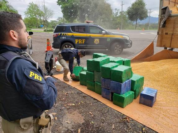 A Polícia Rodoviária Federal apreendeu três toneladas de maconha que era transportada escondida na carga de milho de uma carreta. O fato aconteceu na manhã deste domingo (4), na BR 386, em Lajeado. Um traficante foi preso.