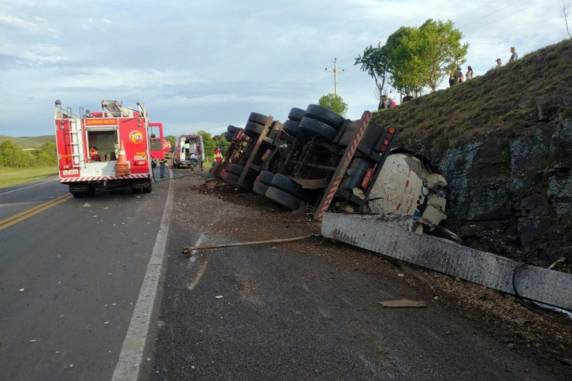 Condutor de carreta fica gravemente ferido em tombamento na BR-386 em Soledade