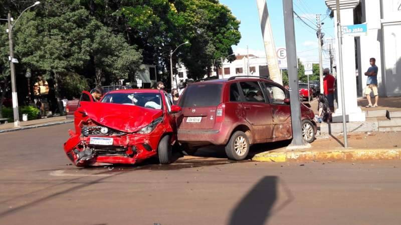 Com o impacto, o Fiat Idea acabou batendo contra um poste de energia na calçada da Igreja da Matriz. A força foi forte o suficiente para quebrar a base de concreto do poste que fica no local.