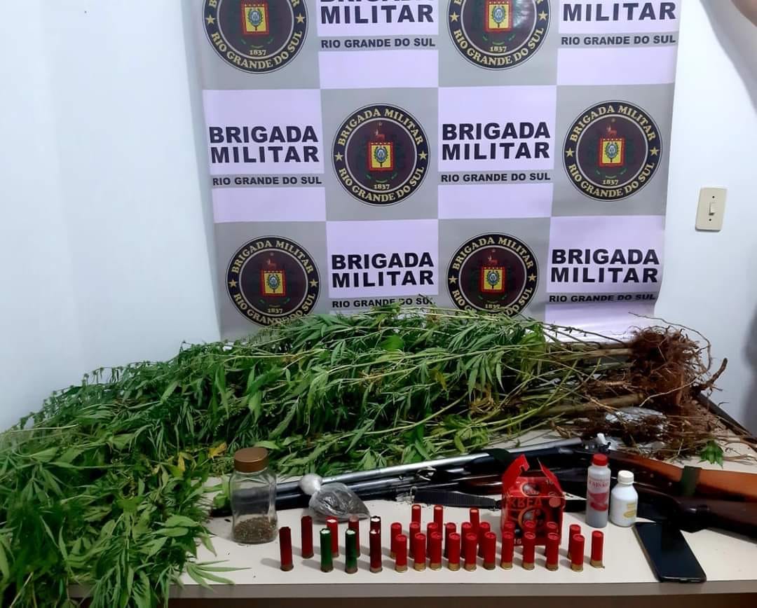 Foram realizadas averiguações no Galpão nos fundos da propriedade com consentimento do mesmo, onde foram encontrados e apreendidos 01 Espingarda Calibre 16, 01 Espingarda calibre 32, 27 munições intactas de calibre 16 e 02 deflagradas, 03 munições intactas de calibre 24, 01 Pote com sementes de Cannabis sativa, 01 frasco de chumbo fino para recarga de cartuchos, 01 frasco de pólvora, 01 porção de 15,75 gramas de maconha pronta para o consumo, 01 celular Marca Motorola.