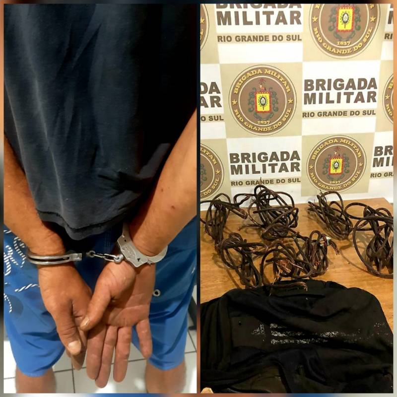 A guarnição permaneceu em buscas nas proximidades do local, sendo que por volta das 04:00h da manhã foi possível a abordagem do indivíduo, de 31 anos de idade, descendo do telhado do armazém em posse de uma mochila, na qual continha aproximadamente 8kg de cabo de cobre 25 mm de espessura, foi dado voz de Prisão ao mesmo sendo encaminhado ao hospital Santa Teresa para Exame de Lesões, posterior a Delegacia de Polícia de Santo Ângelo para Lavratura do Auto de Prisão em Flagrante, posterior encaminhado ao Presídio Estadual de Cerro Largo, onde ficará a disposição da justiça.