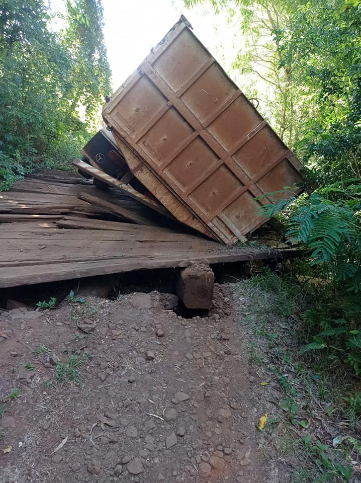 Ponte cede com caminhão carregado na linha Poço Preto interior de Cerro Largo