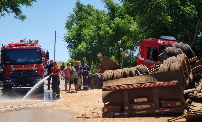 De acordo com as autoridades que atendem a ocorrência o motorista de uma carreta carregada com trigo acabou perdendo controle do veiculo tombando sobre a pista.