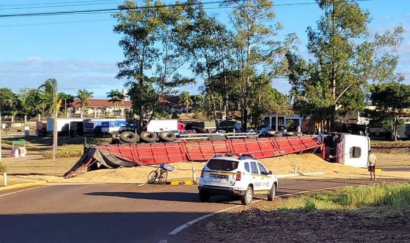 A carreta estava se deslocando com uma carga de trigo para São Paulo. A carga se encontra esparramada sobre a pista. Brigada Militar de Entre-Ijuis controla o trânsito no local.