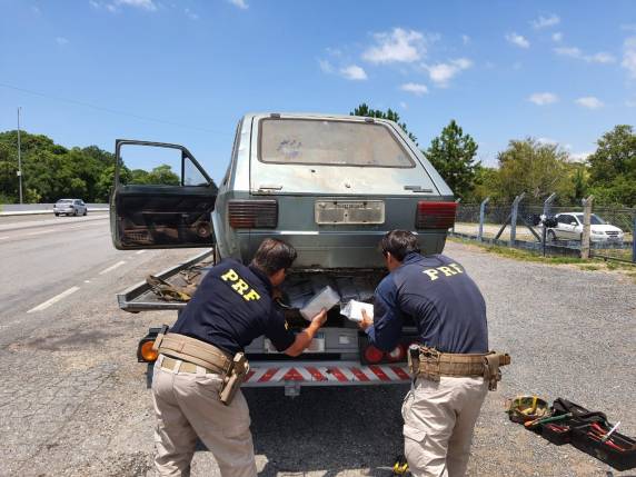 Diante de tantas suspeitas, os policiais iniciaram vistoria detalhada no caminhão e no automóvel embarcado. No Fiat 147, com preço de mercado que não chega a R$ 3 mil, a surpresa: quase R$ 150 mil reais em tabletes de crack escondidos no tanque.