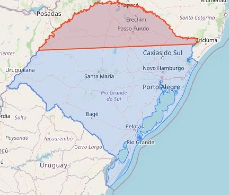 Alerta Chuva forte acompanhada de descargas elétricas, ventos de até 70 km/h e eventual queda de granizo para as regiões em vermelho no mapa.