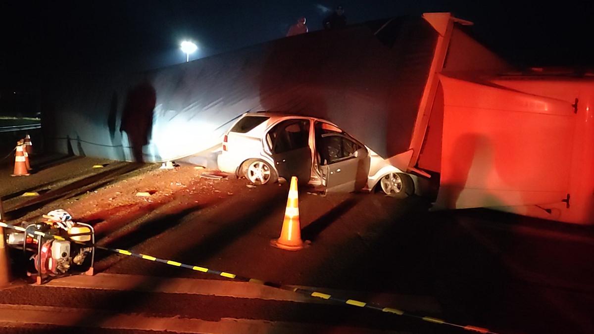 O motorista do veículo que está sob o caminhão morreu no local e outras três pessoas que estavam nesse veículo, foram socorridas e encaminhadas para o Hospital Santa Terezinha, em estado grave.