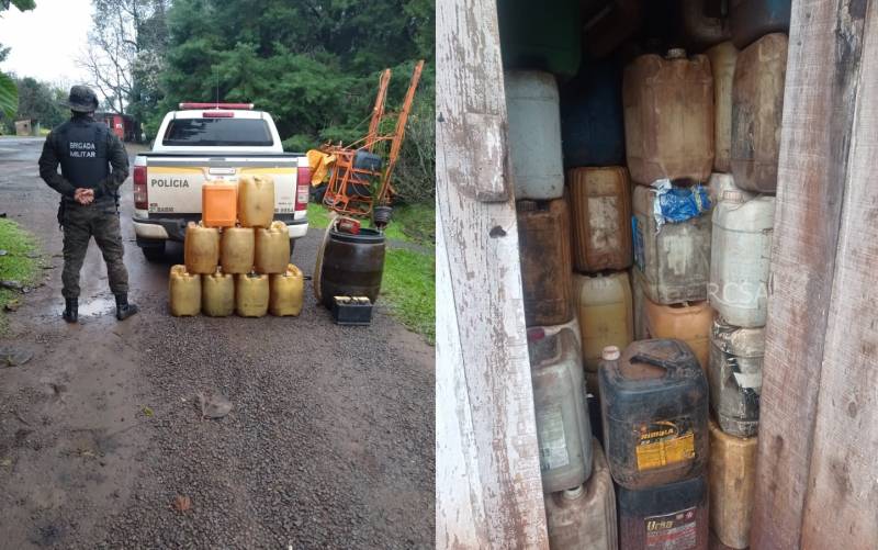 Nesta quinta-feira, 23, uma guarnição do Pelotão Ambiental de Santo Ângelo, realizaram averiguações de denuncia de depósito e comércialização ilegal de combustivel, onde às margens da BR 285, em estabelecimentos, localizados na Esquina Mousquer em Entre Ijuis e na Esquina Rolim de Moura em Vitória das Missões, foram localizados vários recipientes de 20 litros cheios com óleo diesel e também outros vazios, bomba de sucção, bateria automotiva e demais petrechos para a comercialização de combustivel.