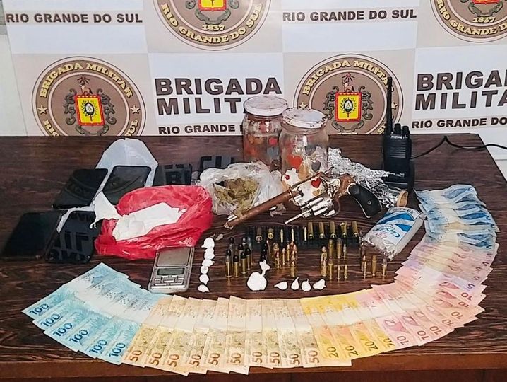 No local abordado, foram apreendidas 73g de maconha, 220g de cocaína, um revólver calibre 38, 19 munições e 6 cápsulas deflagradas do mesmo calibre, 16 munições calibre 9 mm, 3 munições calibre 32, 10 munições calibre 22, um rádio intercomunicador, 6 aparelhos celulares, uma balança de precisão e o valor de R$ 1.291,00.
