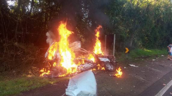 Veículo incendeia após colisão contra caminhão e quatro pessoas morrem, na BR-386 em Iraí