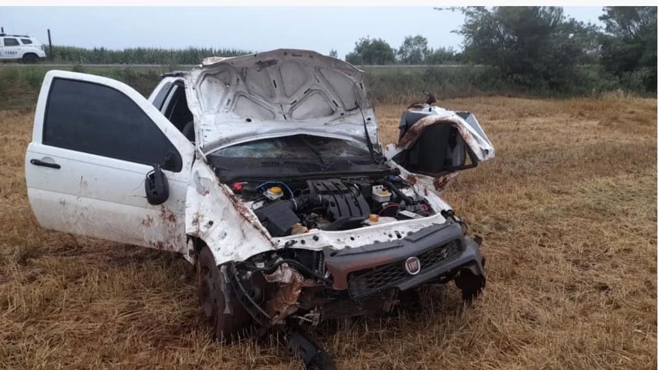 No local encontrou uma Fiat Strada, fora da pista. O veículo foi totalmente danificado por um capotamento. Ao lado do veículo está o corpo da