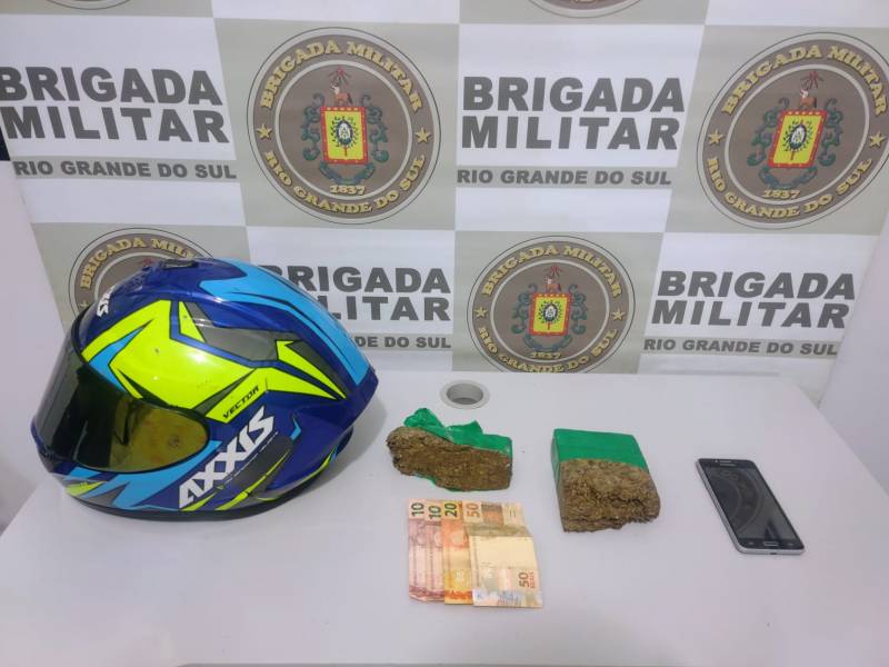 Foi procedida a abordagem policial e o suspeito identificado como um homem de 24 anos, natural de Sto Ângelo, sem antecedentes policiais. Durante a busca pessoal foi localizado com o abordado, dois tijolos de maconha em uma sacola plástica, totalizando 533g, R$ 90,00 em espécie e 01 aparelho celular.