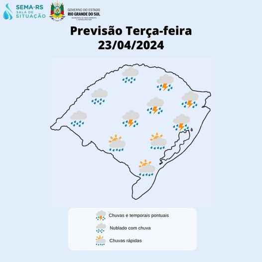 Nesta terça-feira (30), o fluxo de umidade vindo no norte do país segue favorecendo as chuvas intensas com descargas elétricas no Oeste, Missões, Campanha, Centro, Vales, RMPOA, parte da Serra, Leste, Costa Doce e Sul do Estado. Os volumes variam entre 50 e 100 mm, devendo passar dos 150 mm no Centro, Vales, RMPOA e Costa Doce. Além disso, na metade Sul, há risco de tempestades no decorrer do dia, devido ao avanço de uma frente fria sobre o oceano. Durante as instabilidades, os ventos sopram com rajadas em torno dos 50 aos 70 km/h, podendo passar dos 80 km/h.