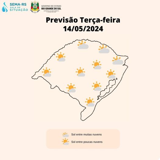Nesta terça-feira (14), a massa de ar seco e frio de origem polar favorece o tempo firme sobre o Rio Grande do Sul e as temperaturas máximas variam entre 10 e 15°C. Os ventos seguem soprando de sudoeste/sul, com rajadas de até 45 km/h nas regiões Sul, Lagoa dos Patos, Guaíba e Litoral e o mar continua agitado.