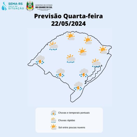 Nesta quarta-feira (22), uma região de baixa pressão juntamente com o fluxo de umidade vindo do norte favorecem a chuva e o vento pontualmente fortes acompanhados de descargas elétricas e eventual queda de granizo sobre a Campanha, Centro-Sul, Sul e Costa Doce. As chuvas serão mais intensas na Campanha e Sul gaúcho, trazendo acumulados entre 70 e 90 mm/dia, podendo passar dos 110 mm/dia no Sul gaúcho. Os ventos sopram de norte/noroeste sobre o território gaúcho, chegando aos 60 km/h em áreas da metade Norte e Oeste gaúcho. As temperaturas máximas ficam em torno dos 26 aos 31°C.