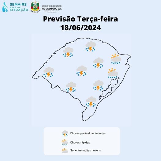 Nesta terça-feira (18), o fluxo de umidade vindo do norte do país aliado à atuação de uma área de baixa pressão segue favorecendo as chuvas pontualmente fortes com descargas elétricas sobre o Noroeste, Norte e Nordeste. No decorrer da tarde e noite, essas instabilidades avançam para as Missões, Norte, Vales, Oeste, Campanha, Sul, Costa Doce e Centro, trazendo chuva forte, descargas elétricas, eventual queda de granizo e rajadas de vento que passam dos 70 km/h conforme as instabilidades atuam. Os volumes variam entre 20 e 40 mm/dia, devendo isoladamente passar dos 50 mm/dia.