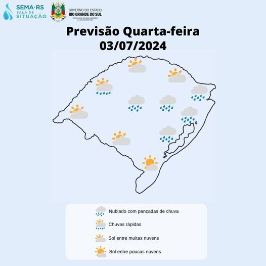 Nesta quarta-feira (03), as pancadas de chuva moderadas a fortes atuam em áreas da Campanha, Centro, Vales, RMPOA, próximo da Costa Doce, Litorais Médio e Norte, e Serra gaúcha, devido ao avanço de uma frente fria sobre o oceano e o fluxo de umidade vindo do norte do país. Os acumulados variam entre 5 e 15 mm/dia, podendo isoladamente ficar acima dos 20 mm/dia em áreas do Centro, Leste e Serra. Com a nebulosidade, as temperaturas máximas ficam em torno dos 15 aos 23°C na maioria das regiões.