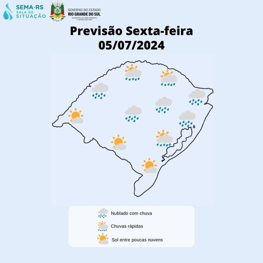 Nesta sexta-feira (05), com o avanço da frente fria sobre o oceano e o fluxo de umidade de norte, as chuvas fracas a moderadas atuam nas regiões das Missões, Noroeste, Centro, Norte, Vales, Serra, RMPOA e Litoral Norte. Os volumes ficam em torno dos 20 e 40 mm/dia, especialmente no Centro, Vales, RMPOA, Serra e Litoral Norte, onde as chuvas podem ser fortes em alguns momentos. As temperaturas da tarde sobem pouco, variando entre 8 e 13°C em praticamente todo o Estado, e ao longo da noite, entram em declínio principalmente na metade Sul do RS.