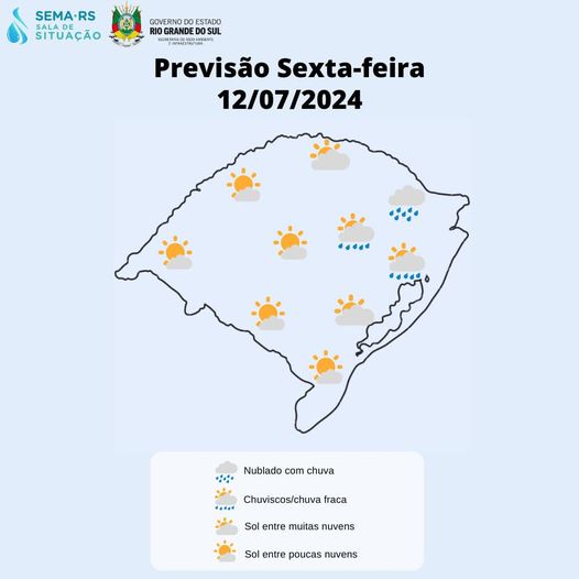 Nesta sexta-feira (12), o tempo firme predomina com sol entre nuvens em boa parte do RS, apenas nos Vales, RMPOA e Nordeste há condição para chuviscos/chuva fraca. As temperaturas máximas novamente sobem pouco e ficam em torno dos 7 aos 13°C.