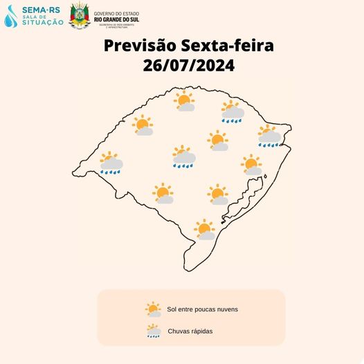 Nesta sexta-feira (26), o tempo estável predomina com sol entre poucas nuvens na maioria das regiões e as temperaturas máximas ficam em torno dos 22 aos 26°C, não passando dos 21°C no Sul e Litoral. Devido à influência de uma área de baixa pressão e do fluxo de umidade de norte, entre a tarde e noite há chance de pancadas isoladas de chuva em pontos do Oeste, Centro, Norte e Serra