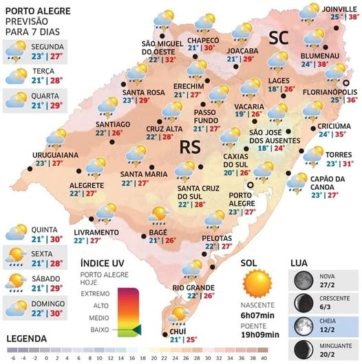 ainda probabilidade de temporais isolados com vendavais e granizo de variado tamanho. Alguns temporais podem ser localmente fortes a severos com danos. A instabilidade alcança cidades mais ao Norte do estado que no domingo não tiveram chuva e que seguem abafadas.