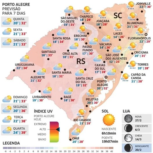 O dia começa novamente com temperatura amena e agradável em quase todas as cidades gaúchas. Entretanto, aquece rapidamente com o sol e a tarde será de calor, com as maiores máximas no Oeste e no Noroeste.