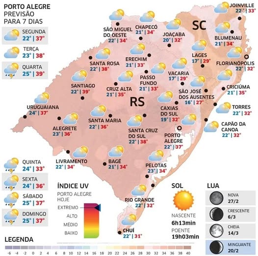 Com isso, um grande número de municípios gaúchos deve romper à tarde a marca dos 35ºC nos termômetros. As regiões Oeste, Centro, Noroeste, Vales e Grande Porto Alegre serão as mais quentes nesta segunda. Na Capital, a mínima é de 22ºC, e a máxima deve chegar aos 37ºC.