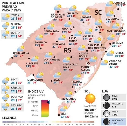 Como a massa de ar quente segue firme, o sol da manhã e do começo da tarde eleva fortemente a temperatura. Será mais um dia de calor intenso, embora com máximas que serão menores do que terça-feira na maioria das cidades, com exceção do Litoral Norte.