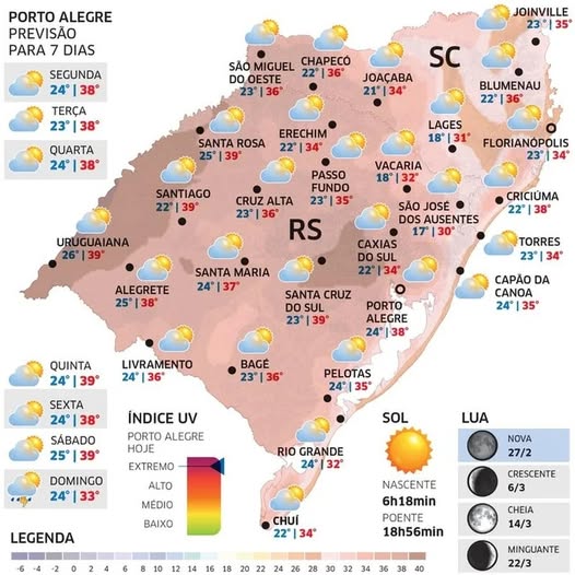 Haverá cidades na Serra com 35ºC s 36ºC à tarde. No Oeste e nos Vales, ao redor de 40ºC. O sol predomina em todo o Estado, apesar de