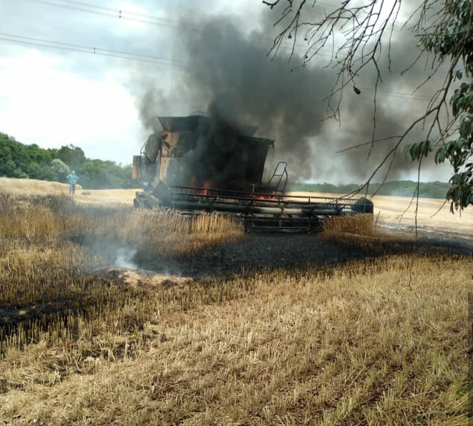 Colheitadeira pega fogo na Linha Concórdia em Guarani das Missões