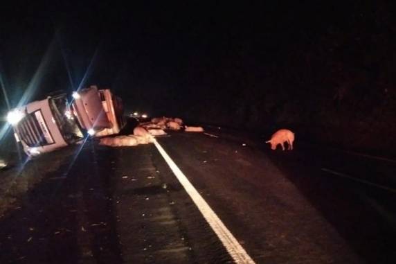 Carreta carregada de porcos tomba e animais saem andando pela BR-386,...