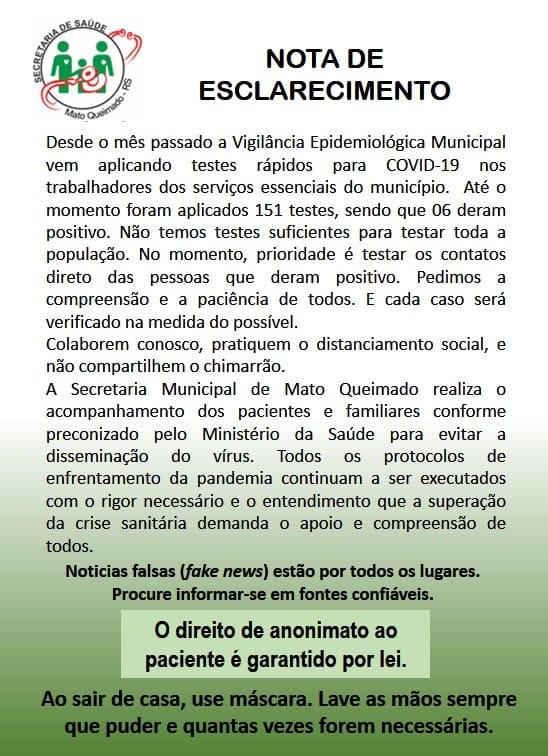 Mato Queimado registra 06 casos de Covid-19 por teste rápido; Acompan...