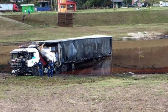 Carreta do RS sai da pista e cai no Rio Uruguai em Chapecó